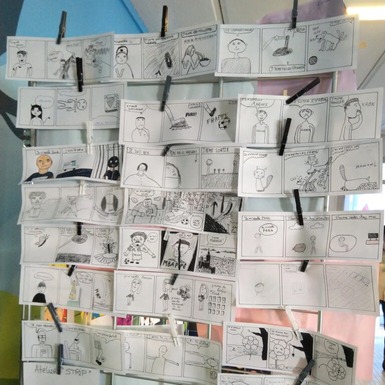 Dans un second temps, un jeu de questions permet d’ouvrir l’imaginaire pour réaliser une histoire de 3 cases. Cet atelier correspond typiquement à un format scolaire : permettant d’appréhender les notions propres à la bande dessinée, de répondre aux questions les plus pertinentes (ou farfelues !) et ensuite de se mettre à l’ouvrage.